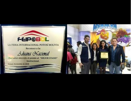 La Feria Internacional Potosí Bolivia (FEIPOBOL) reconoció por segundo año consecutivo a la Aduana Nacional con el Premio al “Mejor Stand Institucional”, en el evento desarrollado del 9 al 18 de noviembre en el Campo Ferial Multipropósito.