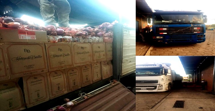 En operativo realizado esta semana en un Punto de Inspección Aduanero Temporal del departamento de Santa Cruz, entre Mora y Río Seco, la Aduana Nacional interceptó dos (2) camiones que transportaban cajas de vino y otra mercancía variada de contrabando escondida debajo de bolsas de cebolla.