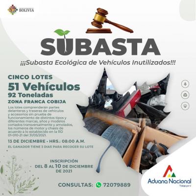 La subasta se llevará a cabo el día lunes 13 de diciembre, de 8:00 a 16:00 hrs. En ese horario los participantes podrán hacer las pujas correspondientes de manera electrónica y los ganadores podrán recoger sus lotes en un lapso de tres días. Los participantes podrán realizar la verificación previa de los lotes en las instalaciones de ZOFRACOBIJA ubicadas en la Carretera Cobija a Porvenir Km 14 ½ de horas 08:30 hasta 12:00.