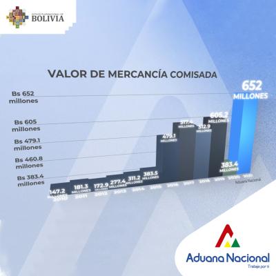 A través del comiso de vehículos, máquinas, aparatos y artefactos mecánicos ilegales se alcanzó un monto de más de 393 millones de bolivianos. En prendería, artículos textiles, prendas de punto y zapatos se comisó 60.6 millones de bolivianos. En equipos electrónicos se llegó a un monto de 54.2 millones de bolivianos. En bebidas, líquidos alcohólicos y tabaco se valuó 52.2 millones de bolivianos y en alimentos como semillas, frutos y otros se alcanzó a comisar más de 32 millones de bolivianos.