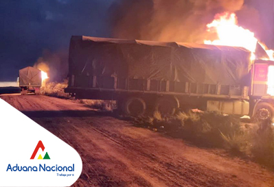 Oruro, 10 de febrero de 2022. AN. Cinco camiones y dos vagonetas que buscaban ingresar mercancía de contrabando a Oruro fueron interceptados en rutas alternas, tras lo cual los contrabandistas usaron armas de fuego y cachorros de dinamita, tratando de evitar el comiso de sus productos, por lo que tres de los cinco camiones tuvieron que ser incinerados en el lugar y dos se transportaron al recinto de la Aduana en Oruro, Pasto Grande.