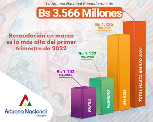 La Paz, 31 de marzo de 2022. AN. En el primer trimestre de 2022, la Aduana Nacional ha recaudado más de 3.566 millones de bolivianos a través del cobro de tributos aduaneros por las importaciones, es decir, el registro y legalización de las mercancías que ingresan al país. En el mes de marzo se obtuvo 1.335 millones de bolivianos, superando así a enero, mes en el que se recaudaron más de 1.102 millones de bolivianos y a febrero, en el que el registro es de 1.127 millones.