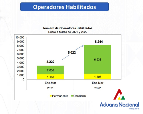 De los 8.244 operadores habilitados en el país, 7.347 son importadores, 827 exportadores, 65 transportadores internacionales terrestres de carga y los cinco restantes, pertenecen a la Agencia Despachante, Empresa de Servicio Expreso (Courier), chárter, transportador internacional aérea y de carga vía fluvial.