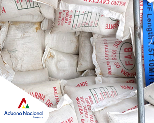 Viernes, 22 de abril de 2022. AN. Dos camiones que transportaban más de 80 toneladas de soya en grano y harina de soya, fueron intervenidos por la Aduana Nacional en Villamontes, Tarija, el valor de la mercancía incautada asciende a 250.000 bolivianos.
