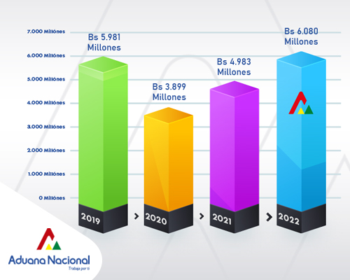 En lo que respecta a recaudación en otras gestiones, la labor de la Aduana en este primer periodo del 2022 supera al 2019 en un 1,7%, ya que la recaudación de esa gestión fue de 5.981 millones de bolivianos; a la gestión 2020 en un 55,9% ya que la gestión tuvo una recaudación de 3.899 millones de bolivianos y a la gestión 2021 en un 22%, ya que esta gestión reportó una recaudación de 4.983 millones de bolivianos, lo que significa un éxito para la institución en pro de la recuperación de la economía nacional.