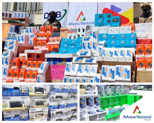 “Fue un duro golpe al contrabando y una tarea encomendada por el Presidente del Estado, Luis Arce. En total comisamos 2.042 celulares, 150 impresoras, 535 reproductores multimedia y máquinas de peluquería. Pedimos a la población que denuncie estos hechos ilícitos y llame a la línea gratuita 800-10-6262”, remarcó Martínez. Actualmente, esta mercancía se encuentra en Recinto de Aduana Interior para proceder con el aforo respectivo.