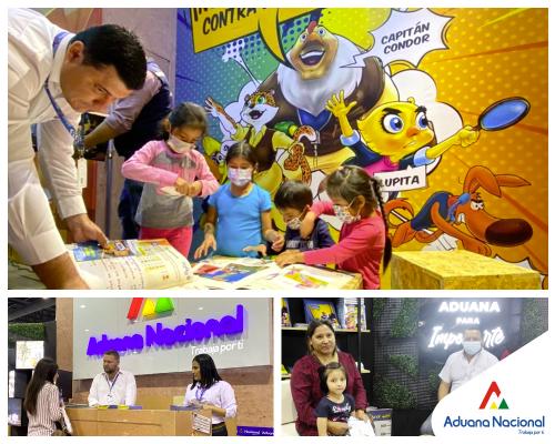 Este año, el stand de la Aduana se caracteriza por su estructura de cuatro cajas gigantes; el primer espacio es destinado al backing fotográfico, el segundo al área corporativa y de atención al público, seguido de un espacio de recreación para niños y finalmente, el área de juego interactivo con dos pantallas.