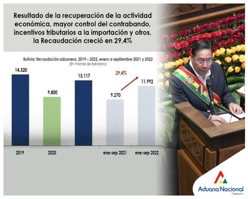 La Paz, 8 de noviembre 2022 AN.- Al conmemorarse el segundo año de gestión de gobierno, el presidente Luis Arce Catacora, en su informe de gestión, destacó que hasta el mes de septiembre la recaudación aduanera llegó a 11.922 millones de bolivianos superando en un 29 por ciento con relación al mismo periodo del año pasado. Al mes de Octubre la recaudación de la Aduana Nacional, se incrementó a 13.497 millones de bolivianos.