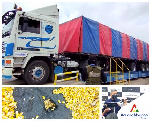 Aduana comisa cuatro camiones con soya escondidos bajo granos de maíz en Yacuiba