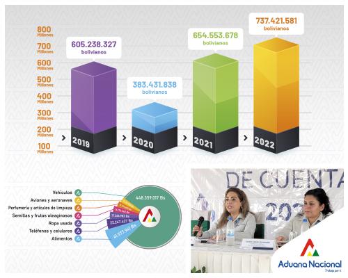 Guayaramerín, 12 de enero 2023 AN.- En el año 2022, la institución aduanera batió récord en el valor de mercancía comisada equivalente en más de 737,4 millones de bolivianos, esto significa un golpe duro al contrabando y apoyo a la producción nacional. En la gestión 2021 se obtuvieron 654.553.678 bolivianos y en el 2020, un valor de 383.431.838 bolivianos, destacó la Presidenta Ejecutiva de la Aduana Nacional, Karina Serrudo, en la “Rendición Pública de Cuentas – Final 2022”.