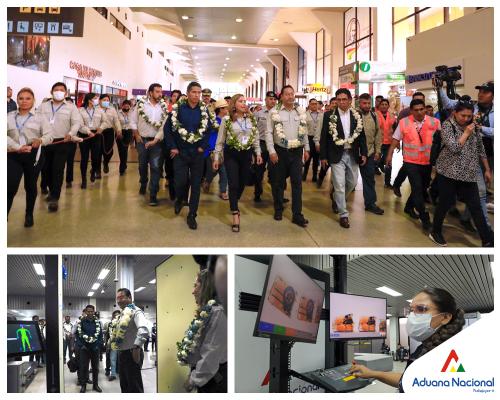 Santa Cruz, 6 de abril de 2023.- Con un simulacro en las áreas de llegadas y salidas internacionales del Aeropuerto de Viru Viru, este jueves el Presidente del Estado Plurinacional de Bolivia, Luis Arce Catacora, el Viceministro de Política Tributaria, Jhonny Morales y la Presidenta de la Aduana Nacional, Karina Serrudo, implementaron 10 nuevos equipos de control no intrusivo (escáneres de equipajes y corporales) destinados para los Aeropuertos Internacionales de Viru Viru y El Alto. Estos equipos fueron adquiridos con el fin de fortalecer los controles aduaneros con tecnología moderna, así optimizar los tiempos de inspección.