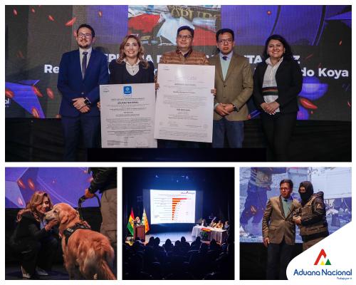 El ministro de Economía y Finanzas Públicas, Marcelo Montenegro y la Presidenta Ejecutiva de la Aduana Nacional, Karina Serrudo, recibieron esta certificación otorgada por primera vez a la institución aduanera, la cual se enmarca en la recaudación lograda a partir del servicio al cliente, gestión de trámites y operaciones, la lucha contra el contrabando, gestión de instrumentos de control al cumplimiento de la normativa aduanera, al igual que la disposición de mercancía y ejecución tributaria.