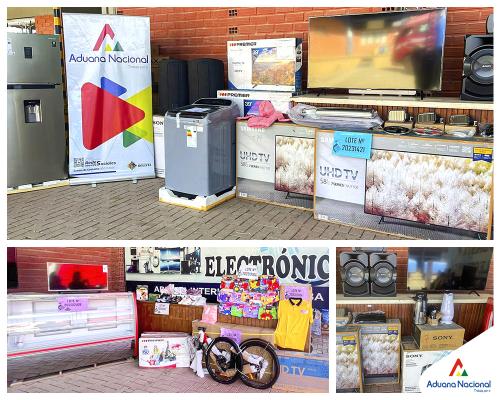“Se trata de ocho lotes de mercancías nuevas y variadas, consistentes en: 125 televisores, 110 sistemas de altavoz , 48 parlantes , 17 equipos de sonido, 155 termos de cocina, 524 fajas de uso personal, 240 pares de zapatos, 36 pares de zapatillas deportivas, 1.164 unidades de ropa interior, entre otros, que pasaron por el proceso de contrabando contravencional, que de acuerdo a la Ley General de Aduanas se trata de todo acto u omisión que infringe la legislación aduanera“, precisó Suarez.