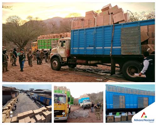 Santa Cruz, 30 de agosto 2023 AN.- Tras un megaoperativo con escolta, la Aduana Nacional y el Viceministerio de Lucha Contra el Contrabando (VLCC) procedieron al seguimiento y allanamiento de un inmueble (finca) ubicada en la localidad de Cuevo, provincia Cordillera – Santa Cruz, donde hallaron tres camiones con 22.532.000 cigarrillos (unidad) ilegales de procedencia paraguaya. Esta mercancía prohibida fue valorada en casi 2 millones de bolivianos y trasladada con fuerte resguardo hasta Recinto de Aduana en Santa Cruz de la Sierra, informó este miércoles el Gerente Regional, José Luis Mollinedo.