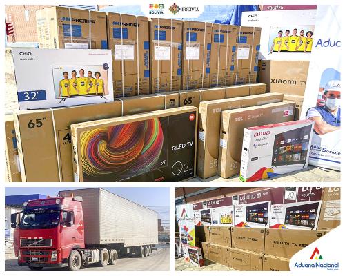 Cochabamba, 12 de septiembre de 2023 AN.- La Aduana Nacional a raíz de una denuncia ciudadana anónima ingresada en el Sistema de Denuncias Aduaneras SIDEA, el 23 de agosto comisó más de 600 televisores, mismos que pretendían ser trasladados de manera camuflada dentro de un furgón de alimentos perecederos . El Gerente Regional de Cochabamba, Hugo Domínguez informo que se trata de mercancía electrónica en su mayoría televisores de última generación valuados en más de Bs. 1.100.000.