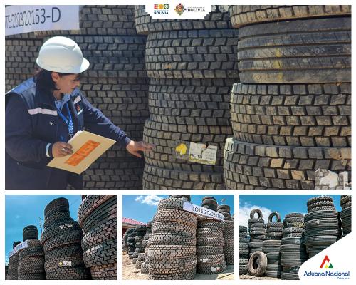La Paz, 6 de octubre 2023 AN.- Tras un despliegue operativo y posterior allanamiento, la Aduana Nacional comisó 6.447 neumáticos con fecha de duración vencido y sin póliza de importación en un domicilio localizado en la ciudad de El Alto, los cuales, fueron valorados en más de 7 millones de bolivianos. La Gerente Regional de Aduana La Paz, Giovanna Cortés, explicó que esta mercancía ilegal proveniente de Corea será inutilizada (cortada en pedazos) y adjudicada en seis lotes bajo “Subasta Ecológica”, todo para que personas y empresas con Licencia Ambiental Categoría 3, lo reutilicen en nuevos emprendimientos.