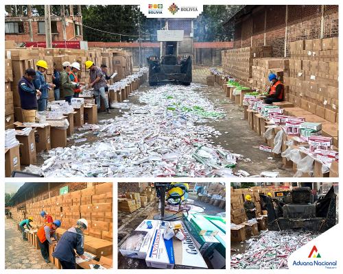 Santa Cruz, 03 de noviembre 2023 AN.- Esta jornada 3 de noviembre, el personal de la Administración de Aduana Interior Santa Cruz inició con la destrucción directa de 36 toneladas de cigarrillos ilegales provenientes de Paraguay, todos equivalentes a 1.3 millones de bolivianos. El Gerente Regional de Santa Cruz, José Luis Mollinedo, remarcó que esta mercancía fue comisada en 15 operativos, ya que por normativa es catalogada como prohibida.