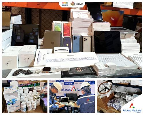 Santa Cruz, 14 de noviembre 2023 AN.- La Aduana Nacional comisó este martes 14 de noviembre, más de media tonelada de mercancía abandonada (computadoras, celulares de alta gama, relojes, prendas de vestir, juguetes y suplementos) que arribaron en septiembre al Aeropuerto Internacional Viru Viru de Santa Cruz (Bolivia), todos provenientes de Estados Unidos. El Gerente Regional de Aduana Santa Cruz, José Luis Mollinedo, informó que estos artículos valorados en 556.800 bolivianos son ilegales porque fueron declarados como herramientas industriales y ante este contrabando técnico, nadie se apersonó para asumir responsabilidad.
