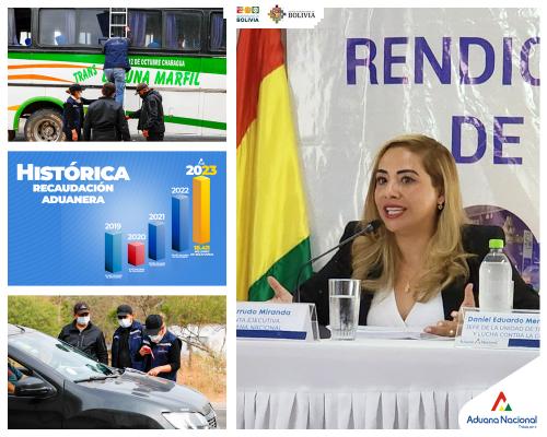Santa Cruz, 25 de enero 2024 AN.- Resultado de un arduo trabajo en fronteras y por primera vez en su historia, la Aduana Nacional recaudó más de 18.411 millones de bolivianos en tributos aduaneros durante la gestión 2023, superando todos los récords alcanzados en más de 30 años. También sobrepasó la meta establecida por el Ministerio de Economía y Finanzas Públicas de 17.250 millones de bolivianos, informó este jueves la Presidenta Ejecutiva, Karina Serrudo, en la “Audiencia Final de Rendición Pública de Cuentas – 2023”, desarrollada en el departamento de Santa Cruz.