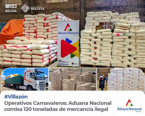Villazón, 20 de febrero 2024 AN. – Villazón: En el periodo festivo de carnaval, la Aduana Nacional intensificó sus controles fronterizos, logrando comisar en cinco operativos, realizados en el Puesto de Inspección Aduanera (PIA) Cuartos, más de 120 toneladas de mercancía ilegal (harina, arroz y aceite comestible), provenientes de Argentina. El Gerente Regional de Aduana Potosí, Alex Yamil Mamani, informó, que estos productos de contrabando valorados en más de 260 mil bolivianos, no contaban con la documentación necesaria para su legal internación al país, como la Declaración de Importación (DIM), factura comercial y certificación sanitaria.