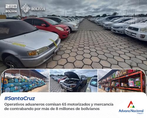 El Gerente Regional de la Aduana Santa Cruz, José Luis Mollinedo, informó que el valor de los motorizados comisados asciende a 8.244.556 bolivianos, y que estos fueron detenidos en diferentes lugares de la ciudad de Santa Cruz, como Satélite Norte, Villa 1ro. de Mayo, feria Barrio Lindo, Plan 3.000, entre otros, y en las ciudades de La Guardia y Montero de ese departamento.