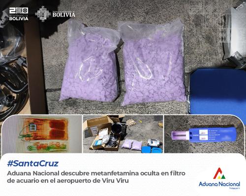 Santa Cruz, 20 de febrero 2024 AN.– La Aduana Nacional y la Fuerza Especial de Lucha contra el Narcotráfico (FELCN) descubrieron 2 paquetes con 4.000 pastillas o dos kilos de metanfetamina, que llegaron al Aeropuerto de Viru Viru, en el departamento de Santa Cruz, camuflados en un filtro externo de acuario, informó el Gerente Regional de la Aduana, José Luis Mollinedo.