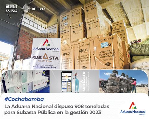Cochabamba, 12 de Marzo 2024 AN.- La Aduana Nacional durante las Subastas Públicas también conocidas como Subastas Electrónicas, realizadas en la gestión 2023, dispuso 908 toneladas de mercancías comisadas con un valor de más de 28 millones de bolivianos, específicamente la Gerencia Regional de Cochabamba dispuso 93 toneladas valoradas en 3.6 millones de bolivianos, Informó el Gerente Regional de Aduana Cochabamba, Hugo Domínguez.