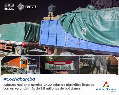 Cochabamba, 18 de Marzo 2024 AN.- En atención a una denuncia realizada por la Policía Caminera del departamento de Cochabamba, la Aduana Nacional intercepta 3 vehículos (dos camiones y una vagoneta), trasportando 2400 cajas de cigarrillo de contrabando con un valor de más de 3,8 millones de bolivianos. El Gerente Regional de Aduana Cochabamba, Hugo Domínguez, informó, que el total de tributos omitidos superan lo permitido por ley, por lo cual se tienen tres personas aprehendidas por el delito de contrabando.