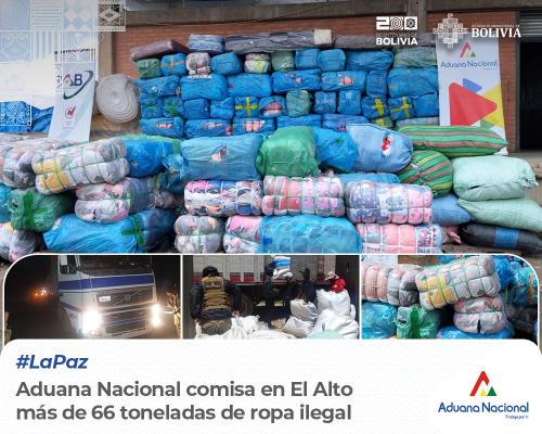 El Alto, 20 de marzo de 2024, AN.- La Aduana Nacional comisó más de 66 toneladas de ropa usada, además de ropa nueva, de contrabando en cuatro operativos realizados en la ciudad de El Alto y Carretera La Paz - Oruro, entre el 10 de enero y el 8 de marzo de esta gestión. La mercancía ilegal está valuada en 1.196.487 bolivianos.