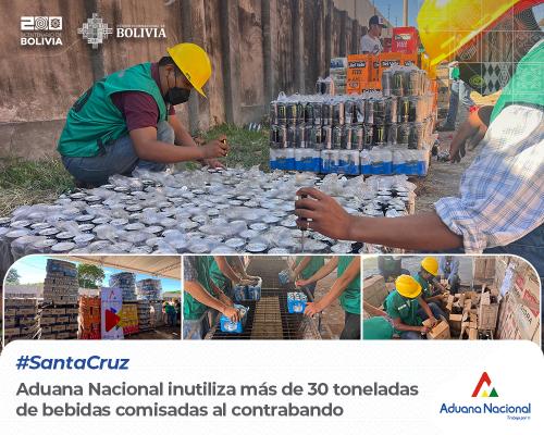 Santa Cruz, 27 de marzo de 2024. AN.- La Aduana Nacional ha iniciado el proceso de inutilización de 30,8 toneladas de bebidas comisadas por contrabando entre 2023 y 2024, valuadas en 332.201 bolivianos, informó la Administradora de Aduana Interior Santa Cruz, Wilma Laime.