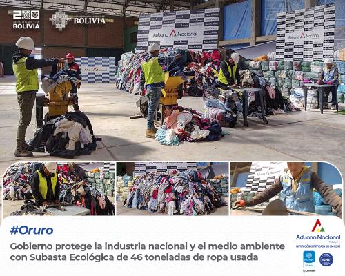 Oruro, 4 de abril 2024 AN. – En Oruro: La Aduana Nacional dispuso 46.5 toneladas de ropa usada de contrabando para ser adjudicadas en dos lotes bajo Subasta Ecológica, todo para que las personas y empresas con licencia ambiental la reutilicen en nuevos emprendimientos, informó el Administrador de Aduana Interior Oruro, Daniel Rodas. “Con esta medida promovemos y protegemos la producción nacional. De Enero a Marzo, dicha prendería usada proveniente de Chile, intentó ingresar a Oruro sin ninguna documentación que acredite su legalidad, por diferentes rutas como Vichuloma, Puente Español, Cala Cala, Bella Vista, carretera Oruro – La Paz y carretera Oruro - Cochabamba”, informó.