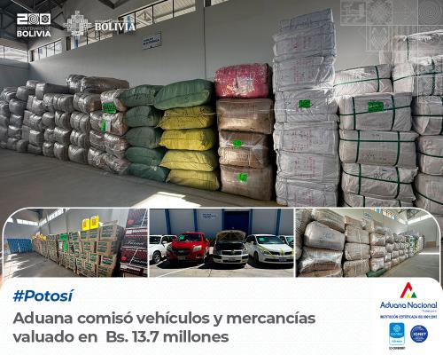Potosí, 12 de abril 2024 AN.– “La Gerencia Regional Potosí, a través, de la Unidad de Control Operativo Aduanero (UCOA) comisó en el primer trimestre de la gestión 2024 más de 13.7 millones de bolivianos con un peso de 514 toneladas de mercancía consistente en vehículos, bebidas alcohólicas, ropa nueva, prendería usada y otros, los comisos fueron realizados en proximidades a la ciudad de Potosí y depositadas en el recinto aduanero de la Administración Aduana Interior” aseguró Alex Yamil Mamani Condori, Gerente Regional Aduana Potosí.