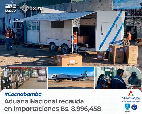 Cochabamba, 14 de mayo de 2024 AN.- El Administrador Aduana Aeropuerto Cochabamba, Armengol Montaño en contacto con la prensa dijo “debo informar a la ciudadanía del país, que en el primer cuatrimestre de la gestión 2024, se logró recaudar en importaciones un total de Bs. 8.996,458; es importante resaltar la confianza que depositan en la Aduana Nacional, que está trabajando 24/7 en la atención de vuelos de ingreso y salida de pasajeros internacionales, recepción de carga, en especial a la población Cochabambina” enfatizó.