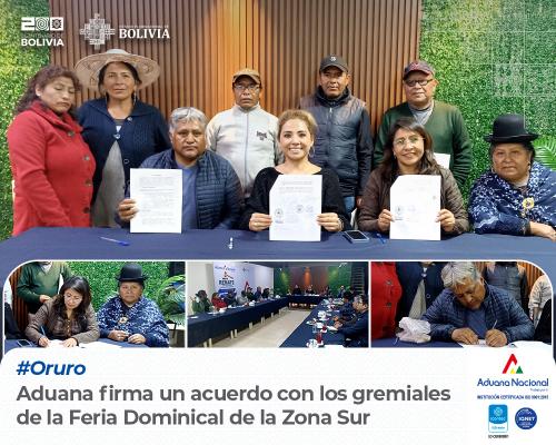 Oruro, 3 de junio de 2024. AN.- La Aduana Nacional y los gremiales de la Feria Dominical de la Zona Sur de Oruro firmaron hoy un acta de entendimiento para realizar un estudio conjunto de importación de menor cuantía por Tambo Quemado y Pisiga.