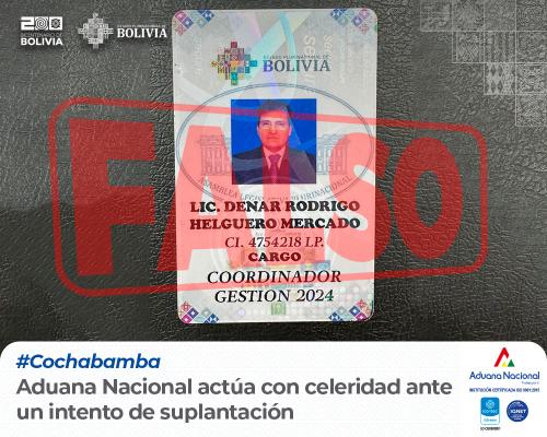 Cochabamba, 17 de junio de 2024. AN.- La Aduana Nacional denunció a Denar Rodrigo Helguero Mercado por hacerse pasar como Coordinador de la Asamblea Legislativa Plurinacional con el propósito de intentar recuperar un vehículo incautado por contrabando.