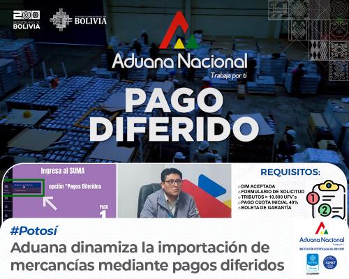 Potosí, 11 de julio 2024 AN.– La Aduana Nacional informa a la ciudadanía que con el fin de agilizar el comercio, entró en vigencia el Reglamento de Pagos Diferidos a Tributos Aduaneros de Importación aplicable a “Declaración de Importación” bajo la modalidad de Despacho General. Para solicitar Pagos Diferidos el comerciante o importador tiene la facilidad de nacionalizar su mercancía con el pago de una cuota inicial del 40% que posibilita la liberación de su mercancía y, la prórroga de pago restante del 60% en cuotas mensuales, bimestrales, trimestrales o semestrales dentro la gestión; previa presentación de garantía (s) a primer requerimiento” señaló Alex Yamil Mamani, Gerente Regional Aduana Potosí.