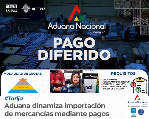 Tarija, 11 de julio 2024 AN.– La Aduana Nacional informa a la ciudadanía que con el fin de favorecer al comercio, entró en vigencia el Reglamento de Pagos Diferidos a Tributos Aduaneros de Importación aplicable a “Declaración de Importación” bajo la modalidad de Despacho General. Para solicitar Pagos Diferidos el comerciante o importador tiene la facilidad de nacionalizar su mercancía con el pago de una cuota inicial del 40% que posibilita la liberación de su mercancía y, la prórroga de pago restante del 60% en cuotas mensuales, bimestrales, trimestrales o semestrales dentro la gestión; previa presentación de garantía (s) a primer requerimiento” señaló Carla Mariela Aguirre, Administradora Aduana Interior Tarija.