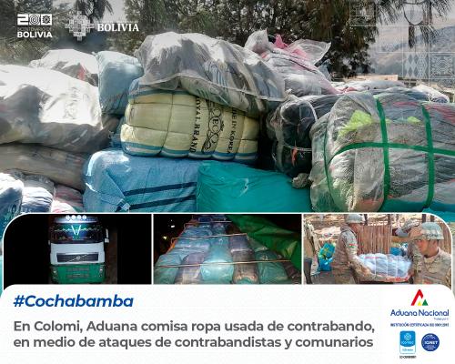 Colomi, 25 de julio de 2024. AN.- En medio de una emboscada y un ataque perpetrado por contrabandistas y comunarios, la Aduana Nacional, a través de su Regional de Cochabamba, comisó ropa usada de contrabando que intentaba ingresar a la ciudad de Cochabamba, según informó Hugo Domínguez, Gerente Regional de Aduana Cochabamba.