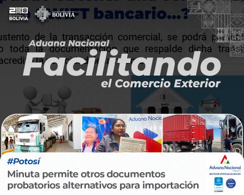 Esta apertura a otros documentos probatorios se enmarca en el artículo 54 del Reglamento de la Comunidad Andina, de la cual la Aduana Nacional es parte. La normativa permite la aceptación de documentos distintos al SWIFT bancario; en ese entendido los importadores podrán presentar documentos alternativos, entre ellos: