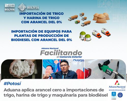 Potosí, 26 de agosto de 2024.AN .- “La Aduana Nacional, tras conocer la promulgación y publicación de los Decretos Supremos (DS) Nros. 5195 y 5197 del 14 de agosto de 2024, ha iniciado la adecuación de sus sistemas informáticos para garantizar la aplicación inmediata a las importaciones de trigo, harina de trigo y equipos para la producción de biodiesel, con el gravamen arancelario del cero%” señaló el Gerente Regional Aduana Potosí, Álex Yamil Mamani.
