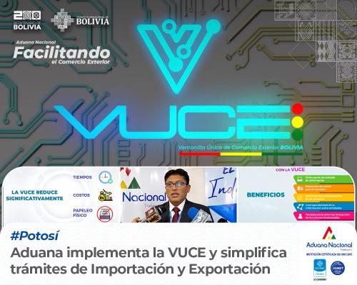 Potosí, 9 de septiembre de 2024. AN.- La Aduana Nacional implementa la Ventanilla Única de Comercio Exterior (VUCE), conforme establece el Decreto Supremo 5211 del 28 de agosto pasado. Esta normativa tiene como objetivo “simplificar, agilizar, estandarizar y modernizar las operaciones de comercio exterior, aprovechando los avances en tecnologías de la información y comunicación” destacó Álex Yamil Mamani, Gerente Regional Aduana Potosí.