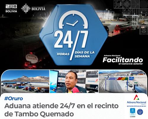 Oruro, 9 de septiembre de 2024. AN.- En el Recinto Multipropósito de Tambo Quemado se ofrece atención bajo el esquema 24/7, es decir, 24 horas del día y los siete días de la semana, con el objetivo de garantizar el libre tránsito hacia los puertos del Pacífico, un derecho de Bolivia según el Tratado de Paz y Amistad con Chile de 1904, informó el Gerente Regional de la Aduana Nacional, Olberth Maydana.