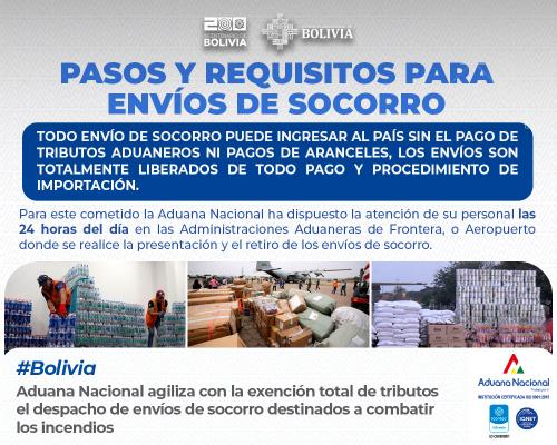 No es necesario presentar una Declaración de Mercancías, y la Entidad Pública o Institución Privada solo debe registrarse en la Aduana Nacional en cualquier punto del país. Solo se requiere que la mercancía esté debidamente identificada como envío de socorro y consignada a la institución estatal responsable de su distribución o a cualquier institución privada de beneficencia acreditada.