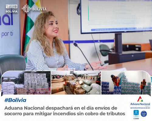 La Paz, 13 de septiembre de 2024. AN.- La Aduana Nacional atenderá y despachará en el día los envíos de socorro destinados a mitigar los incendios en varias regiones del país. Esta medida responde a una instrucción del Presidente del Estado, Luis Arce, quien ha implementado un plan sólido y contundente para contener el fuego, según informó la Presidenta de la Aduana, Karina Serrudo.