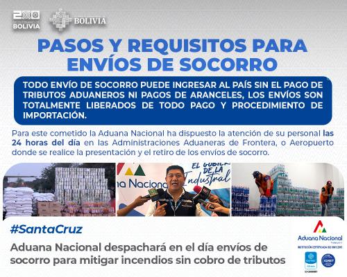 No es necesario que se declare emergencia o desastre nacional para activar estos envíos de socorro, ya que está vigente la modalidad de Envío de Socorro, contemplado en el Artículo 197 del Reglamento a la Ley General de Aduanas (Decreto Supremo N° 25870, de 11 de agosto de 2000).
