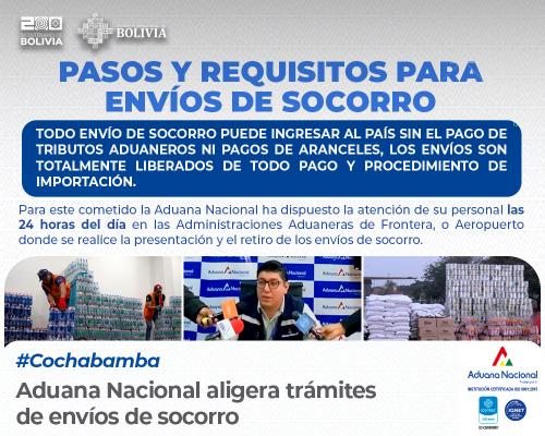 No es necesario presentar una Declaración de Mercancías, y la Entidad Pública o Institución Privada solo debe registrarse en la Aduana Nacional en cualquier punto del país. Solo se requiere que la mercancía esté debidamente identificada como envío de socorro y consignada a la institución estatal responsable de su distribución o a cualquier institución privada de beneficencia acreditada.