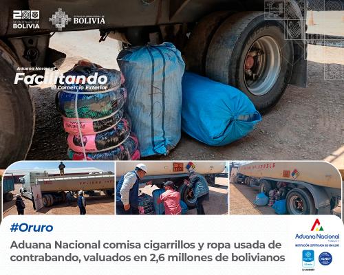En el primer operativo, el Grupo de Reacción Inmediata (GRIA) acudió a un llamado de la Fuerza Especial de Lucha contra el Narcotráfico (FELCN), que detuvo un camión cisterna con ropa usada camuflada. El operativo se realizó a la 1:00 a.m. y se confirmó que el cargamento consistía en ropa usada, cuya importación y comercialización están prohibidas en el país. Tanto la mercancía como el camión fueron trasladados al recinto aduanero de Pasto Grande en Oruro. Tras la evaluación, se determinó que la mercancía tenía un valor de 200.000 bolivianos. Como la ropa usada carece de certificados sanitarios por ser prohibida, será destruida.
