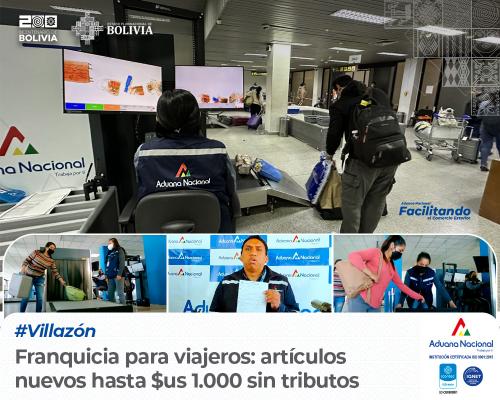 Villazón, 29 de octubre de 2024. AN.- “Los viajeros internacionales, tanto bolivianos como extranjeros, que ingresen o salgan temporalmente del país tienen derecho a una franquicia hasta un valor de 1.000 dólares, que les permite ingresar artículos nuevos para consumo personal sin el pago de tributos,” aseguró Edwin Rolando Flores, Administrador Aduana Frontera Villazón.