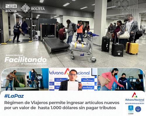 La Paz, 30 de octubre de 2024. AN.- Los viajeros internacionales, tanto bolivianos como extranjeros, que ingresen o salgan temporalmente del país tienen derecho a una franquicia que les permite ingresar artículos nuevos para consumo personal sin el pago de tributos, hasta un valor de 1.000 dólares.