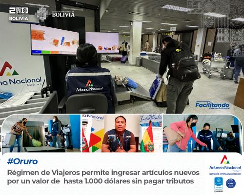 Oruro, 4 de noviembre de 2024. AN.- Los viajeros internacionales, tanto bolivianos como extranjeros, que ingresen o salgan temporalmente del país tienen derecho a una franquicia que les permite ingresar artículos nuevos para consumo personal sin el pago de tributos, hasta un valor de 1.000 dólares.